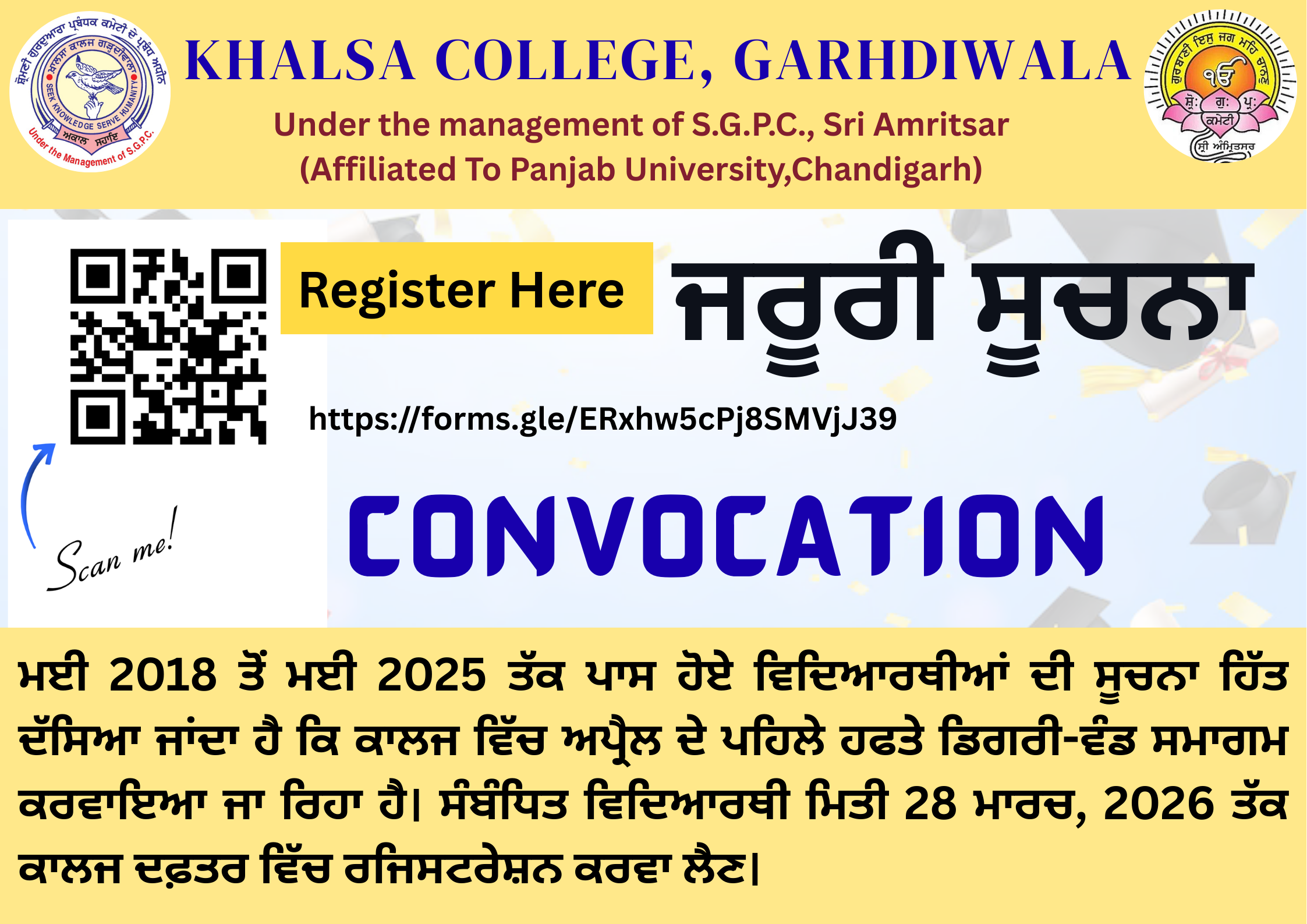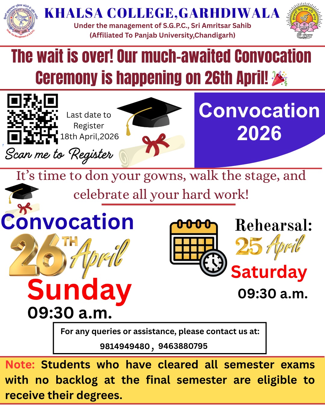 Presently, Khalsa College Garhdiwala is a multi-faculty, postgraduate, co-educational institution, with a campus spread over 9 acres of land. The college is housed in a well-maintained building comprising a spacious hall, smart classrooms, a seminar hall, well-equipped science laboratories, a girls’ hostel, a well-furnished library, computer laboratories, and classrooms. Students receive their education in a healthy environment and enjoy the benefits of rural life.
