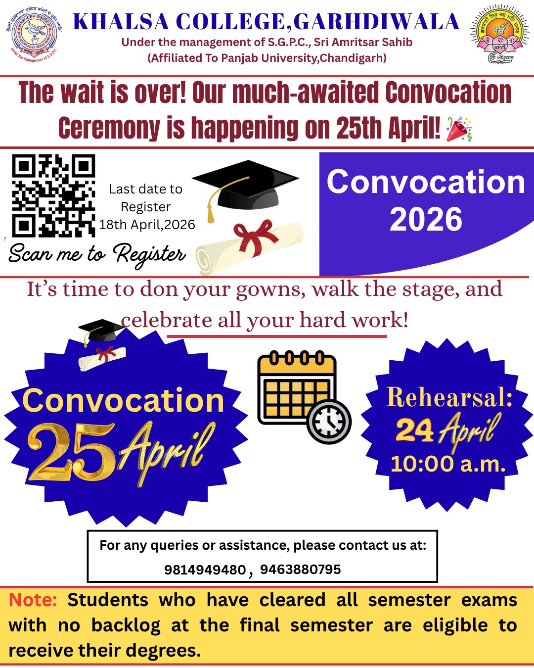 Presently, Khalsa College Garhdiwala is a multi-faculty, postgraduate, co-educational institution, with a campus spread over 9 acres of land. The college is housed in a well-maintained building comprising a spacious hall, smart classrooms, a seminar hall, well-equipped science laboratories, a girls’ hostel, a well-furnished library, computer laboratories, and classrooms. Students receive their education in a healthy environment and enjoy the benefits of rural life.